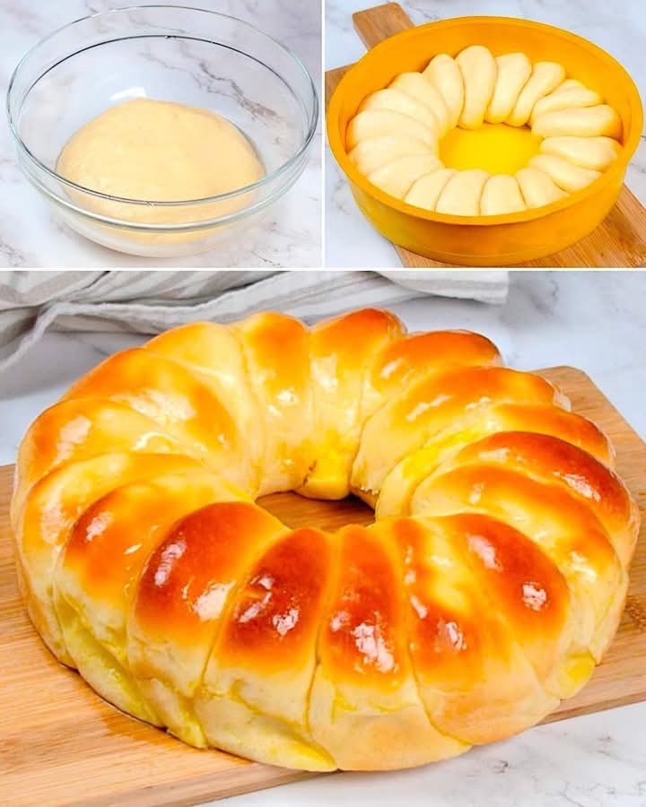 ZUTATEN 300 g (2 1/2 Tassen) Allzweckmehl; 40 g (3 1/4 Esslöffel) Zucker; 2 g (½ Teelöffel) Salz; 7 g (1 ½ Teelöffel) Trockenhefe; 1 Ei; 140 ml (⅝ Tasse) heiße Milch; 40 g (2 Esslöffel) Frischkäse; 30 g (2 Esslöffel) Butter; 300 g (2 Tassen) Vanillepudding. VERFAHREN Fortsetzung auf der nächsten Seite