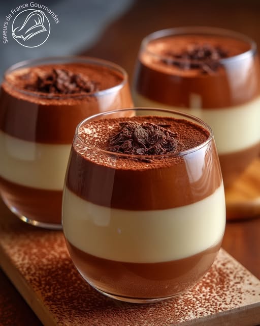 Ideal in einem gekippten Glas für einen Wow-Effekt, kombiniert diese Panna Cotta die Süße von Vanille, die Intensität von dunkler Schokolade und die Tiefe von Kakao 🍮. Bereiten Sie es im Voraus vor, um Ihre Gäste ohne Stress zu beeindrucken.