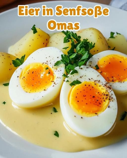 Die halbierten Eier in die heiße Senfsoße legen und sofort servieren. Empfehlung: Zusammen mit gekochten Kartoffeln anrichten.
